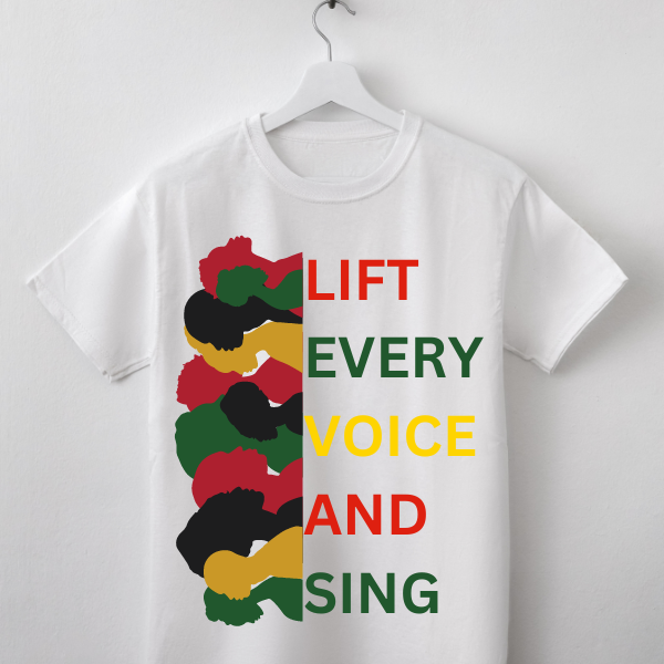 🎨 Unique Design: Featuring the powerful words "Lift Every Voice and Sing" in a striking font, complemented by an elegant graphic of a group of faces in different African colors.